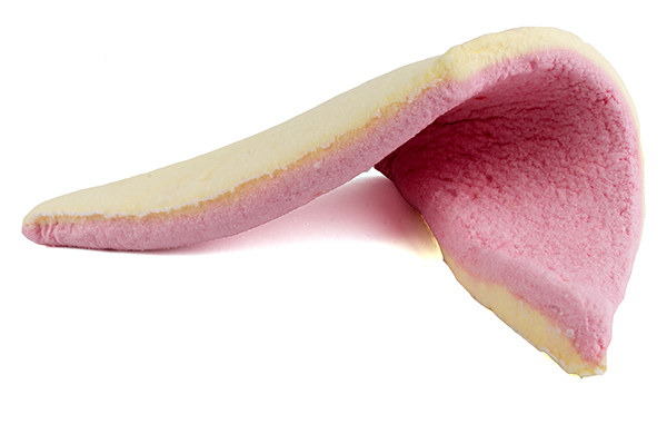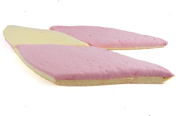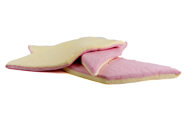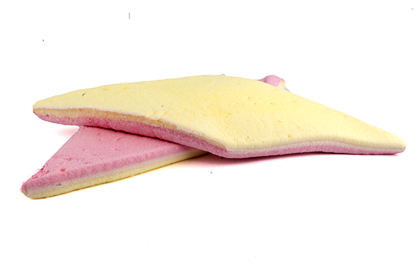 Dit is een echt klassiek Belgisch spekje in maxi uitvoering. Denk aan een luchtige marshmallowstructuur, maar dan nét steviger dan een standaard spekje. Niet taai, wel mooi veerkrachtig. En dat suikerlaagje? Dat is dun, maar precies genoeg om de eerste bite wat contrast te geven. Qua smaak zit je in de vertrouwde spekjeshoek: zacht zoet, romig en comfortabel. Geen extreme smaken, geen salmiak-achtige verrassingen, maar juist dat fijne romige en zachte gevoel. En door het formaat eet je ‘m anders dan een zak spekjes. Dit is geen graaien, dit is snijden, delen, proeven.