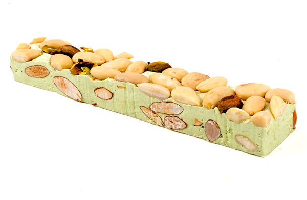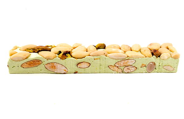 Honing, eiwit, amandelen, pistache nootjes, glucose siroop, suiker, maïsmeel, aroma, natuurlijke kleurstof op basis van kurkuma extract en chlorofyl, eetpapier bestaande uit aardappelzetmeel en palmolie. Kan sporen van andere noten, sulfiet en vruchten bevatten, bewaren bij maximaal 20 graden.